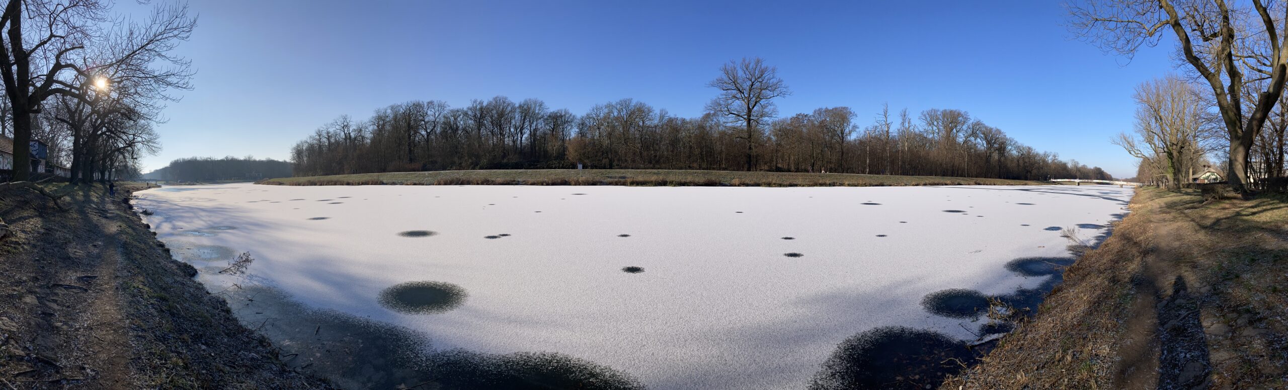 Talking of trust, when I reach the river I see the local ufologists were right: flying saucers have been night fishing in the Elster. Dotted over the surface of snow and ice are perfect circles where the spacecraft hovered. They’re small, mind, but we shouldn’t compare inseams with every creature we encounter. These can, after all, cross galaxies. Little folk with big ambitions(*).